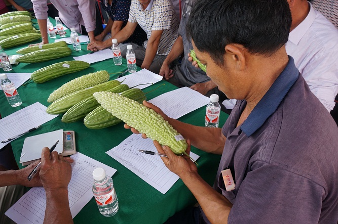 早晨九點(diǎn),苦瓜參賽報(bào)名截止。專家評(píng)委團(tuán)紛紛入場(chǎng)。這些受邀的專家可不是天天坐辦公室研究數(shù)據(jù)和標(biāo)點(diǎn)符號(hào)的,可都是當(dāng)?shù)亟?jīng)驗(yàn)豐富的苦瓜種植老手或能手。