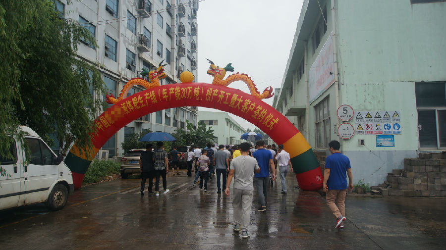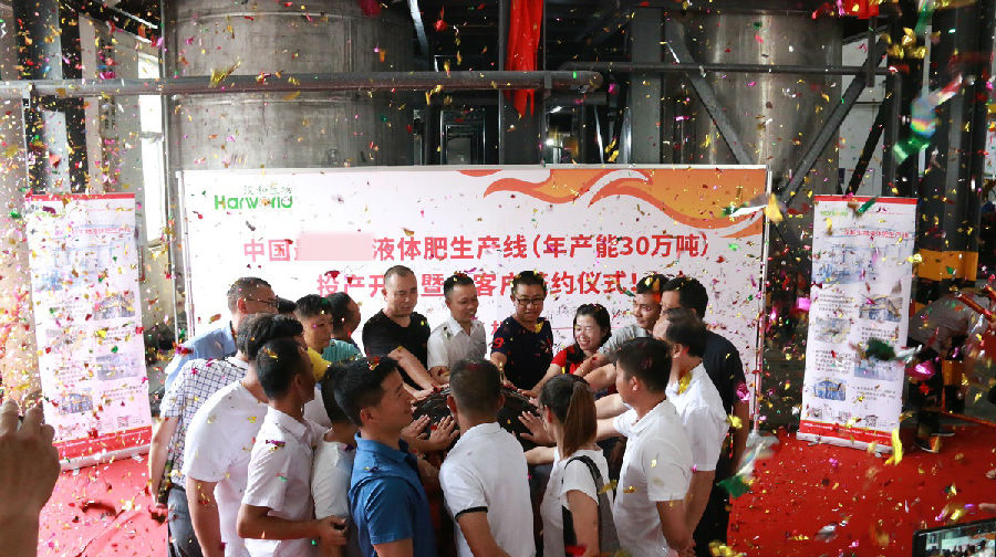 開機儀式正式開始,眾人按動水晶球,音樂伴隨著禮花應聲響起,漢和30萬噸級液體肥生產線順利開工!